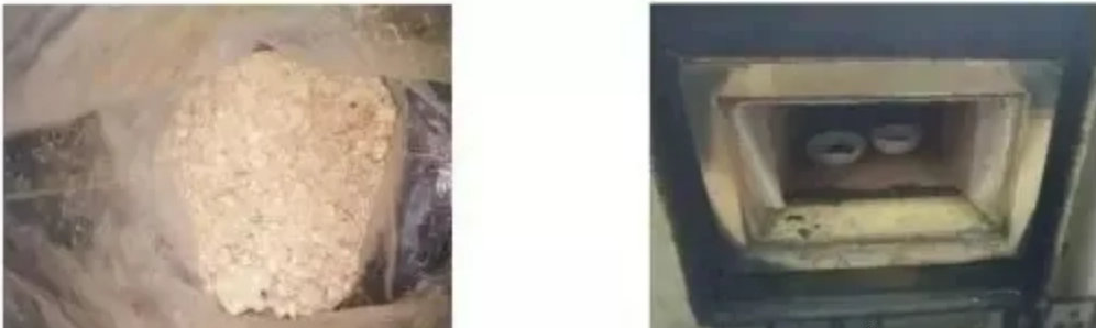 調(diào)研過多家醫(yī)藥化工企業(yè)RTO爐,發(fā)現(xiàn)大部分企業(yè)RTO爐在運(yùn)行一段時(shí)間后,蓄熱床層底部有二次污染物大量積聚(如圖2)、黏附現(xiàn)象,易造成蓄熱床層底部堵塞,引發(fā)火災(zāi)等安全事故。以某醫(yī)藥企業(yè)為例,經(jīng)過取樣試驗(yàn)分析發(fā)現(xiàn),該二次污染物具有以下特性: