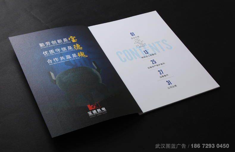 畫冊(cè)設(shè)計(jì)解決方案:從2012年第一本畫冊(cè)設(shè)計(jì)合作開始,武漢圖藍(lán)廣告就以專業(yè)的畫冊(cè)設(shè)計(jì)服務(wù),贏得了寶德機(jī)電公司領(lǐng)導(dǎo)的高度認(rèn)可,至2018年,畫冊(cè)經(jīng)歷過三次改版,從第一版的綠色風(fēng)格到第二版的藍(lán)色風(fēng)格,再到第三版的極為簡(jiǎn)潔的白色,畫冊(cè)也緊跟公司發(fā)展趨勢(shì),完成了一次次的蛻變。